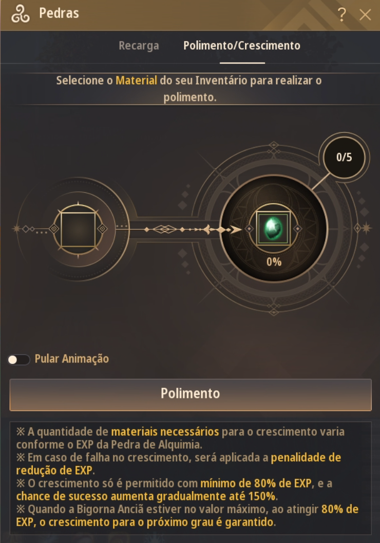 • Ao combinar Pedras de Alquimia, as Pedras com Bênção ou as Pedras Esplêndidas com Bênção só podem ser combinadas após extrair a Pedra de Refinamento.