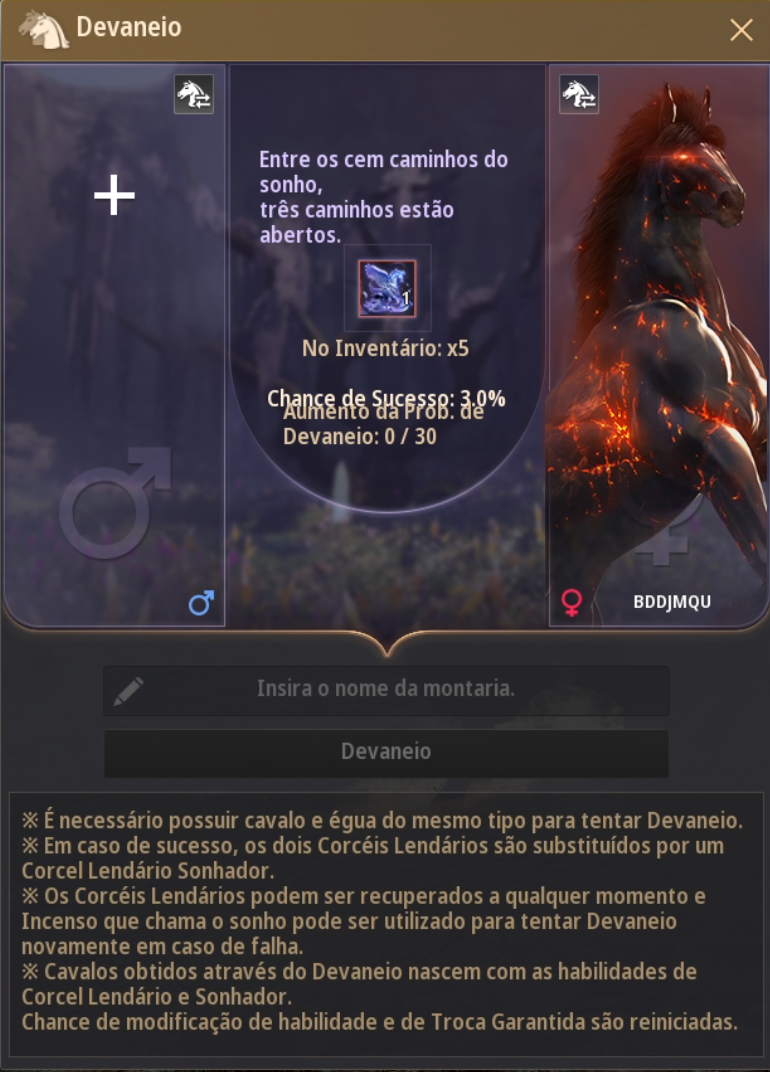 • O nome do Corcel dos Sonhos não é registrado automaticamente, sendo necessário inseri-lo manualmente.