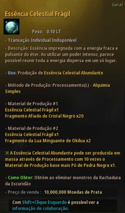 ▲ Verificar o Material e o Método de Produção na explicação de Item da Essência Celestial Frágil.