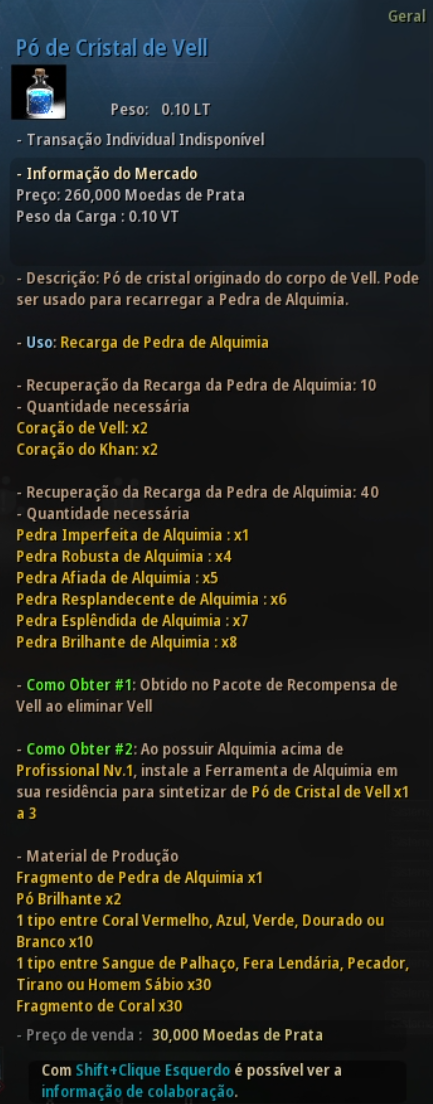 ※ Cada receita poder ser produzida em massa ao realizar Alquimia Simples com 10 vezes os materiais e Pó de Pedra Negra x1.