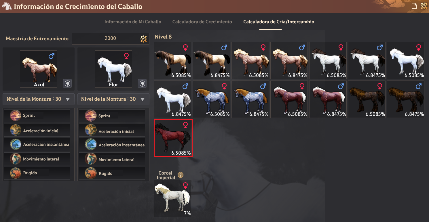 Menú (ESC) - Información de crecimiento del caballo - Calculadora de cría/intercambio.