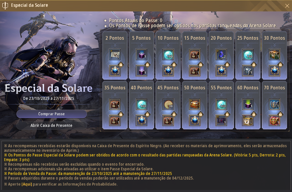 - Qualquer “Passe Especial Solare” não utilizado será removido após o término do período de obtenção de recompensas.