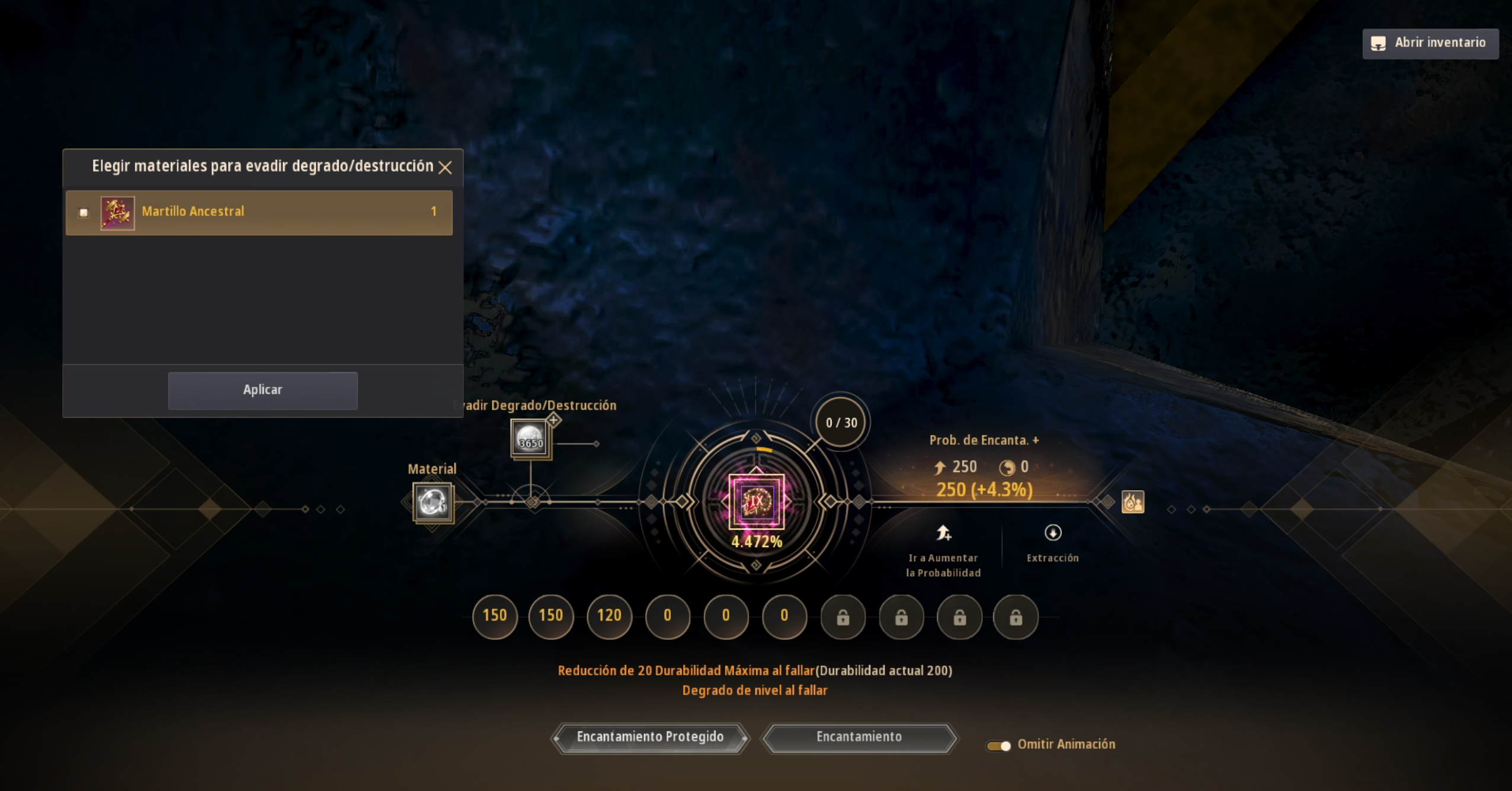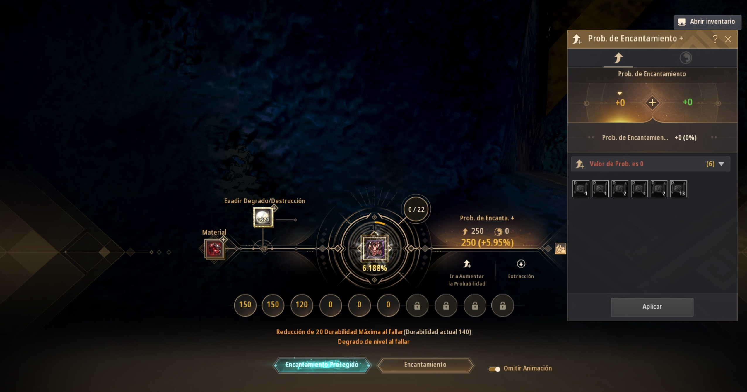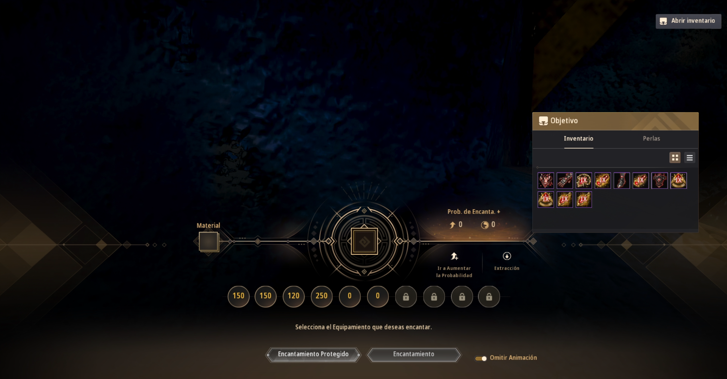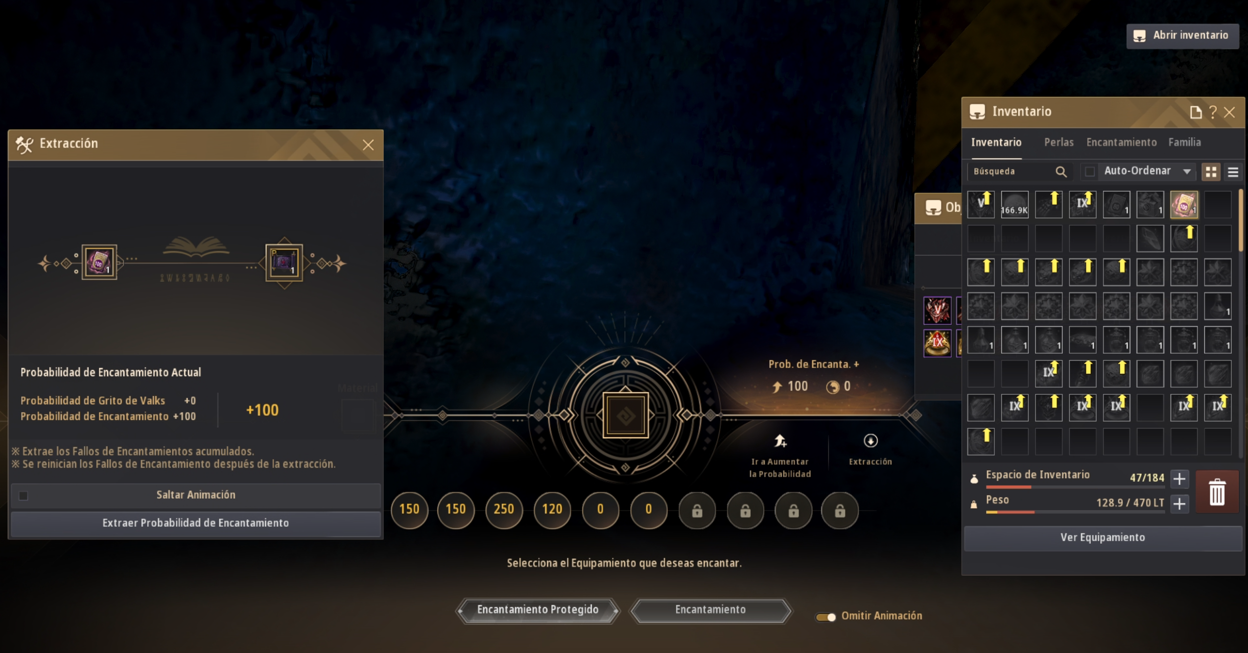 - El Inventario de Encantamiento tiene un máximo de 192 espacios y no tiene restricción de peso. En la ventana de Probabilidad de Encantamiento puedes ver y usar equipos que permiten