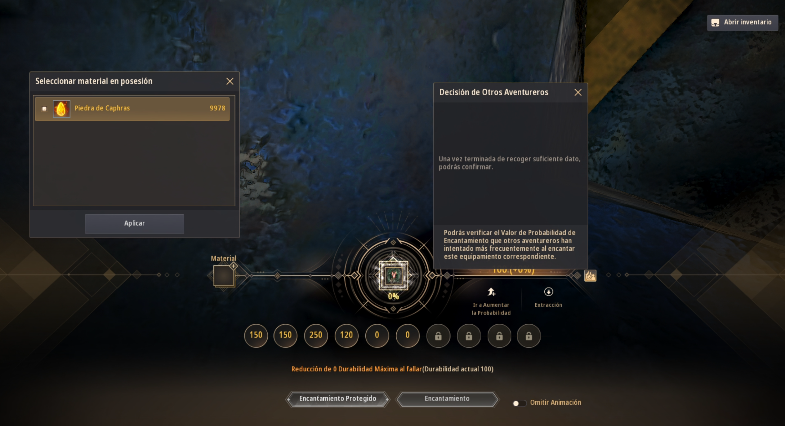 - El botón para encantar ahora está dividido en 'Encantamiento Protegido' y 'Encantamiento'. El botón de 'Encantamiento' solo se habilita si no registraste materiales de protección.