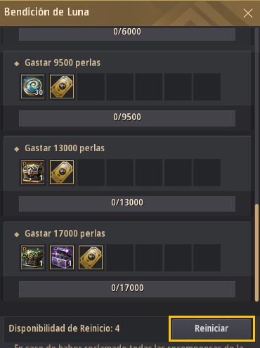 * Si hay problemas al recibir recompensas tras un reinicio, vuelve a abrir la Tienda de Perlas para reclamarlas.