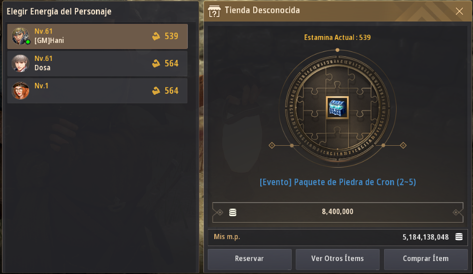 | Piedra de Cron x100,000 | [Evento] Caja de Lingote de Oro de Shakatu | Piedra de Cron x30,000 | [Evento] Cofre del Tesoro Resplandeciente de Shakatu |