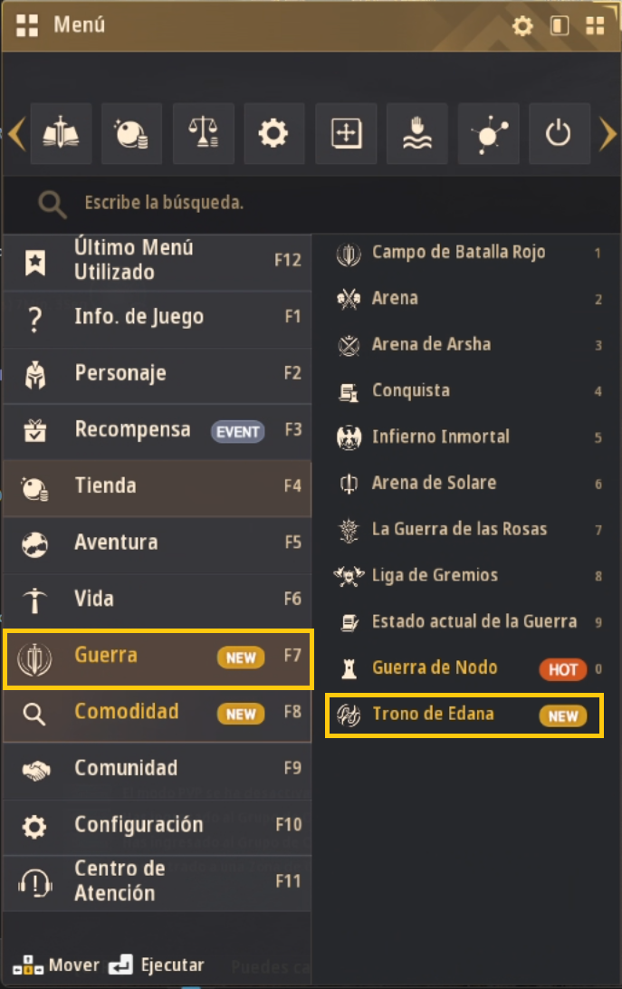 - Por Menú (ESC) - Guerra (F7), ahora puedes abrir la IU del Trono de Edana desde aquí.