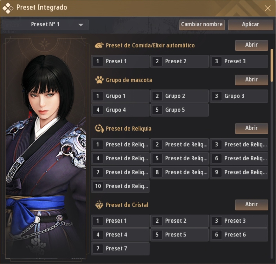 - Ejemplo) Si solo hay 5 espacios de Preset de Mascotas abiertos, en el Preset Integrado solo se mostrarán hasta el Preset hasta 5.