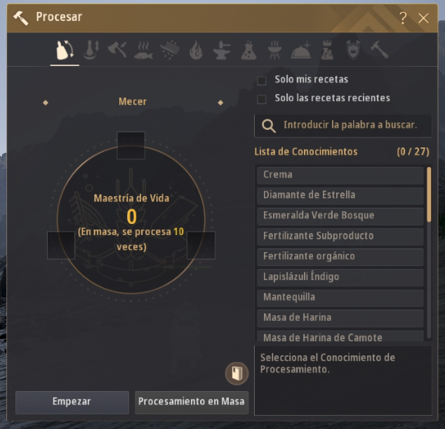 Anteriormente, era necesario pasar el Mouse sobre cada Conocimiento para ver su descripción. Ahora, la Explicación de Conocimiento se muestra directamente en la parte inferior de la ventana. Además, al seleccionar un Conocimiento de Procesamiento, se mostrará la interfaz de Recién Procesamiento exitoso, funcionando de la misma manera que en Cocina y Alquimia.