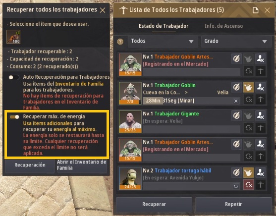 - Al usar esta función, se consumirán los ítems de recuperación necesarios para restaurar la energía del trabajador hasta su límite.