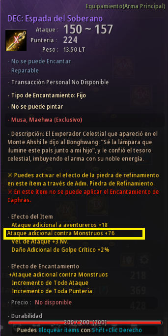 (El stat "Ataque adicional a todas las razas" se cambia a "Ataque adicional contra Monstruos" y se incluye en el valor de Sin suma de razas) |