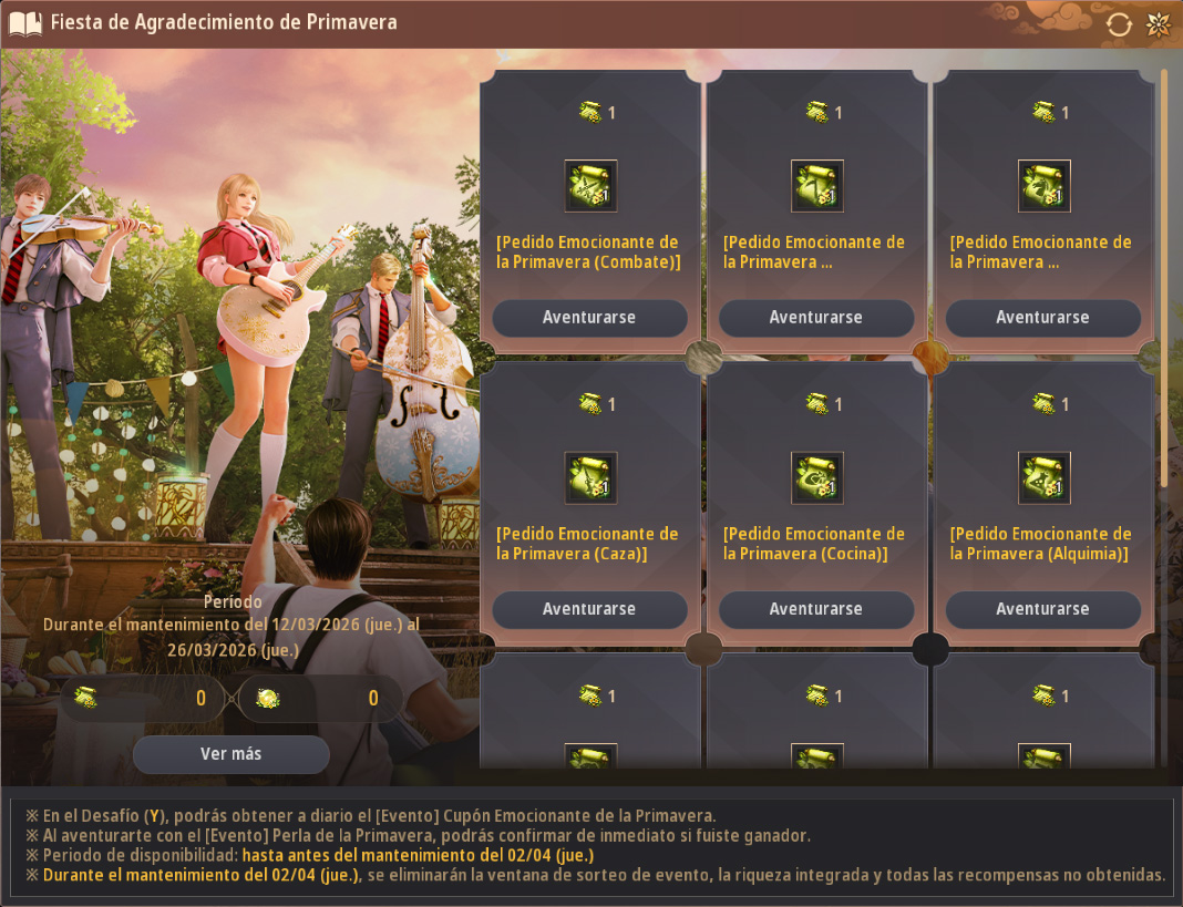 | 12 de marzo de 2026 (jue) después del mantenimiento | - Desafío Ronda 1 - "[Evento] Cupón Especial de la Primavera" sin usar de la Ronda 1 |