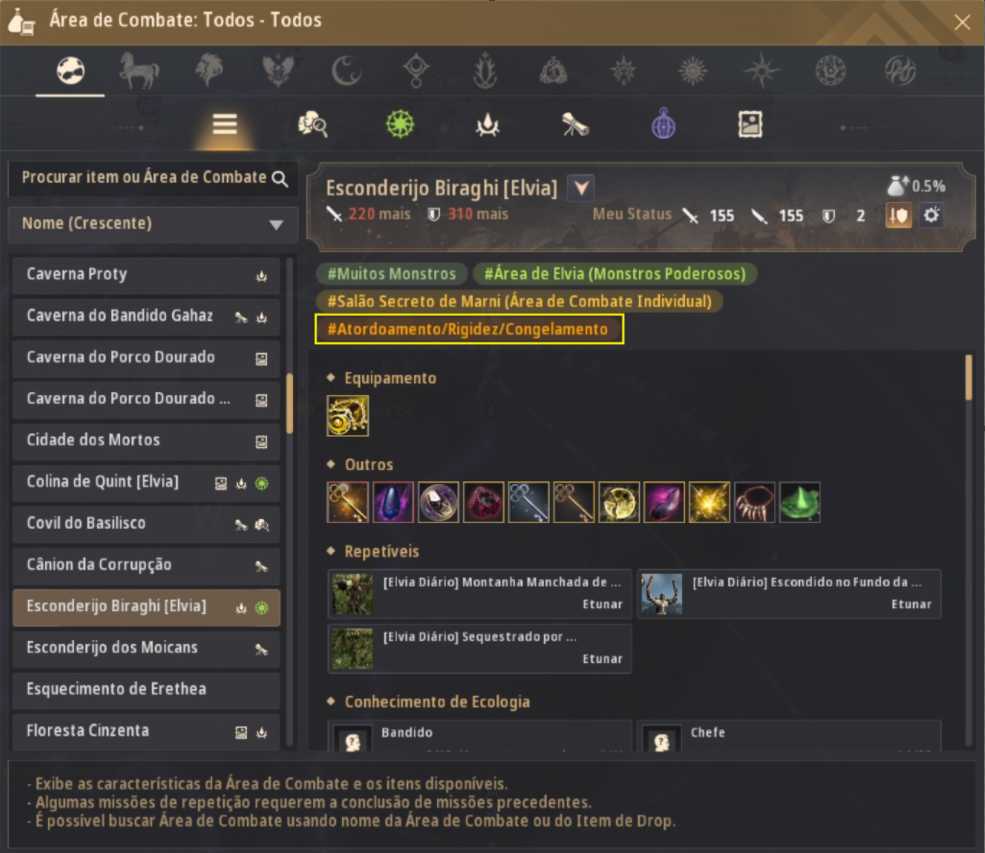 Pensando nisso, agora os tipos de penalidade aplicados pelos monstros foram padronizados de acordo com cada área de combate, tornando o ajuste das resistências mais intuitivo e simples. Também adicionamos informações à interface da área de combate, permitindo que você saiba com antecedência quais penalidades deve se preparar para enfrentar em cada área."
