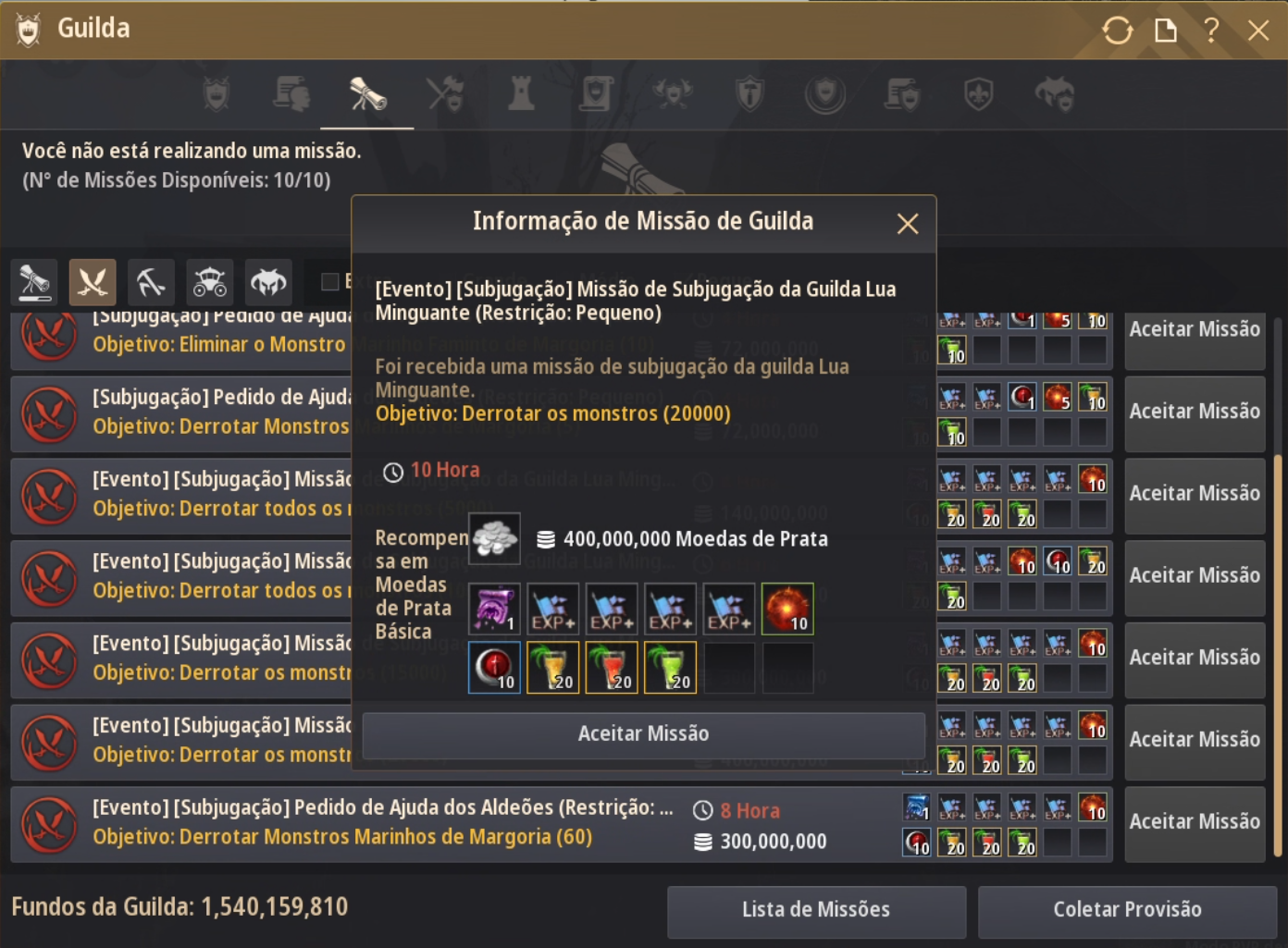* Apenas membros da guilda com permissão para Aceitar/Concluir Missões de Guilda podem iniciar e concluir essas missões.