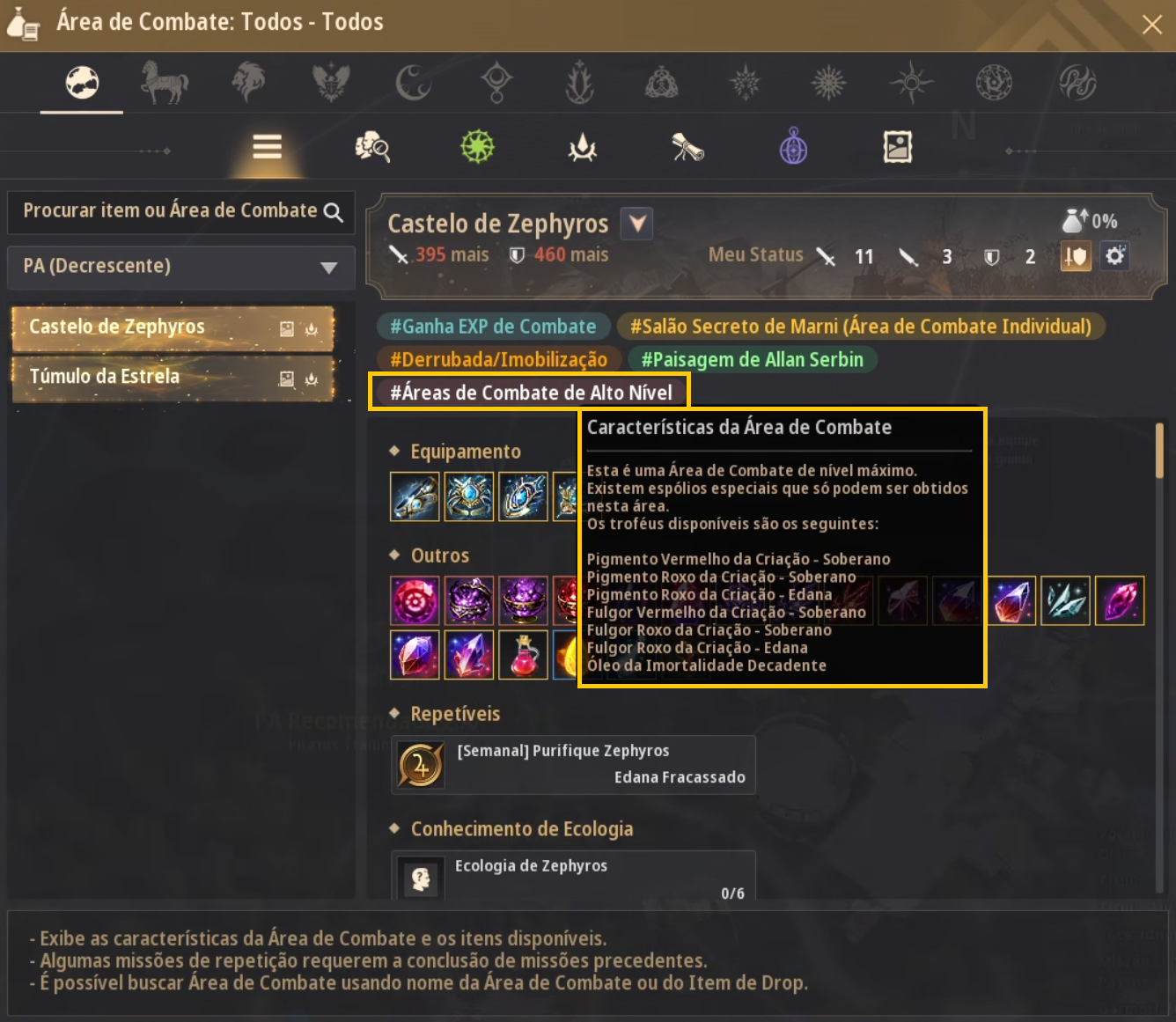 - Adição de #Áreas de Combate de Alto Nível como hashtag na informação da Área de Combate do Castelo de Zephyros.