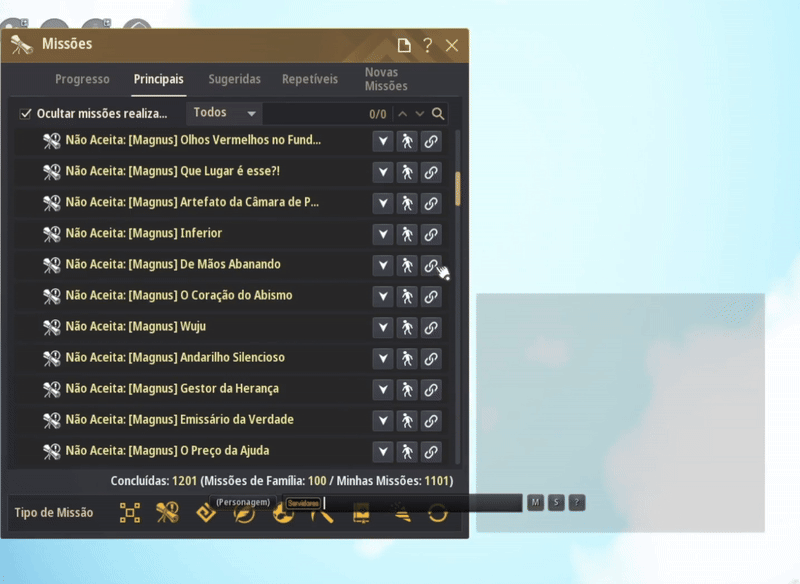 - Para aceitar missões pelo mural, é necessário que a opção “Repetição” esteja ativada na janela de missões (O).