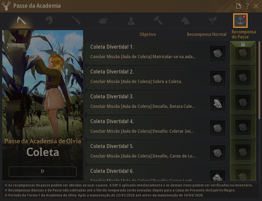 - Melhoria para que seja indicado claramente quando ainda houver recompensas pendentes para coleta na aba das disciplinas do Passe da Academia de Olvia.