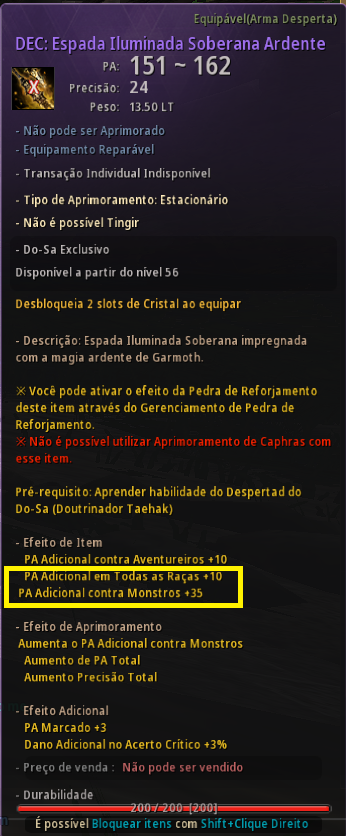 Atualmente, ao visualizar os atributos do personagem com base na Capacidade Final, é possível conferir os valores somados do PA Adicional contra Raças, como Humanos, Kamasylvia, Humanoides e Edania. O efeito de "PA Adicional em Todas as Raças", presente em equipamentos como a Arma Principal e a Arma Desperta Soberana, também é contabilizado nesses valores.No entanto, quando o monstro era do tipo "Geral", não havia um filtro para visualizar essa Capacidade Final, o que dificultava o cálculo exato do PA Final. Para melhorar essa experiência, alteramos o efeito de "PA Adicional em Todas as Raças" para "PA Adicional contra Monstros".
